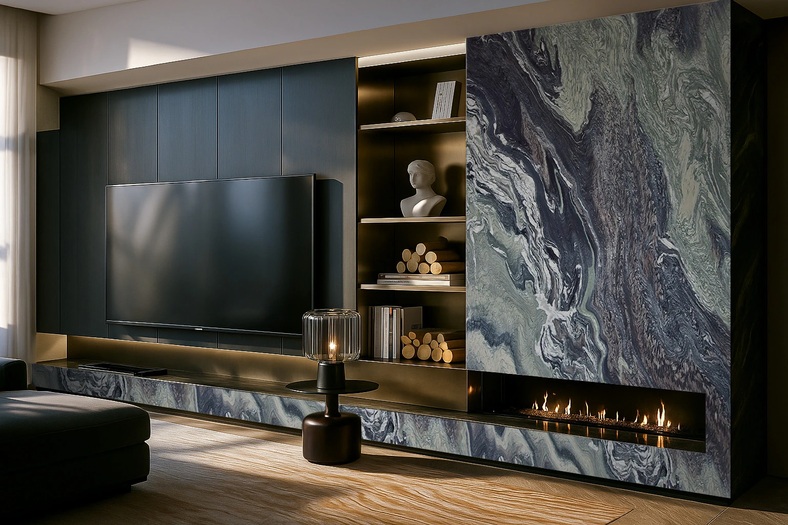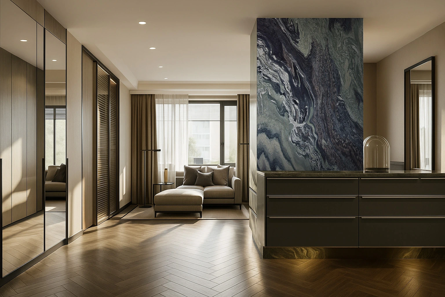 Charcoal-gray canvas layered with swirling sage-green currents and whisper-thin lavender veins, evoking windswept mountain ridges under a stormy twilight sky.