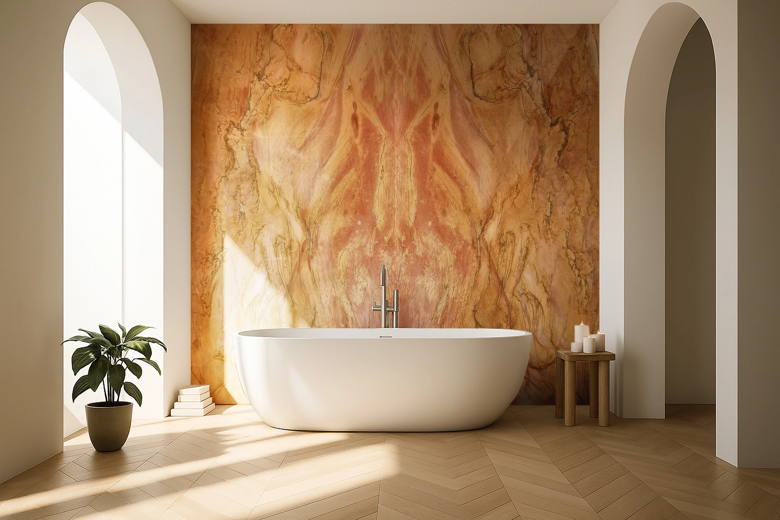 Warm amber canvas veined with blush-pink currents and gilded rivulets—like rain-streaked sunset light frozen in stone.