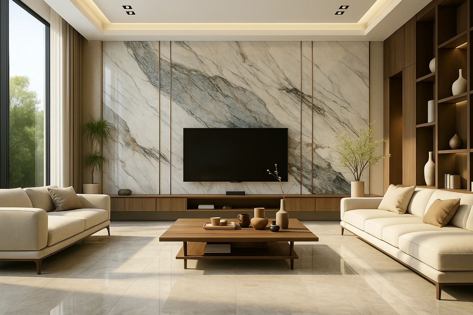 A soft dove-gray field veined with striking streaks of deep blue crystal, evoking the serene flow of glacial waters. Its subtle texture and cool palette lend a calm, contemporary elegance to any interior.