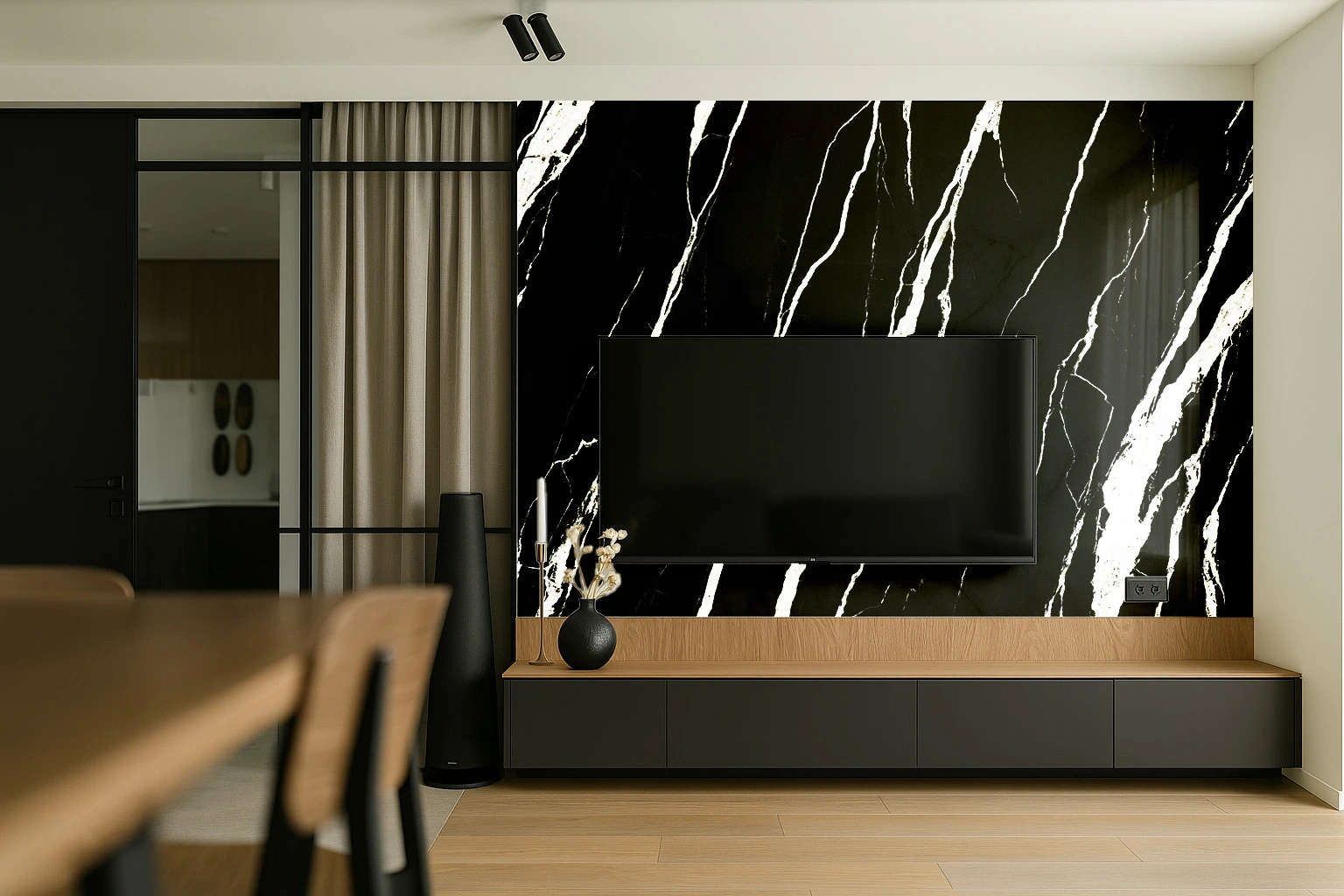 A deep, inky backdrop is dramatically scored by bold, chalk-white veins that slice across the surface in dynamic, diagonal sweeps. The stark bookmatched pattern brings a striking sense of motion and modern sophistication to any setting.