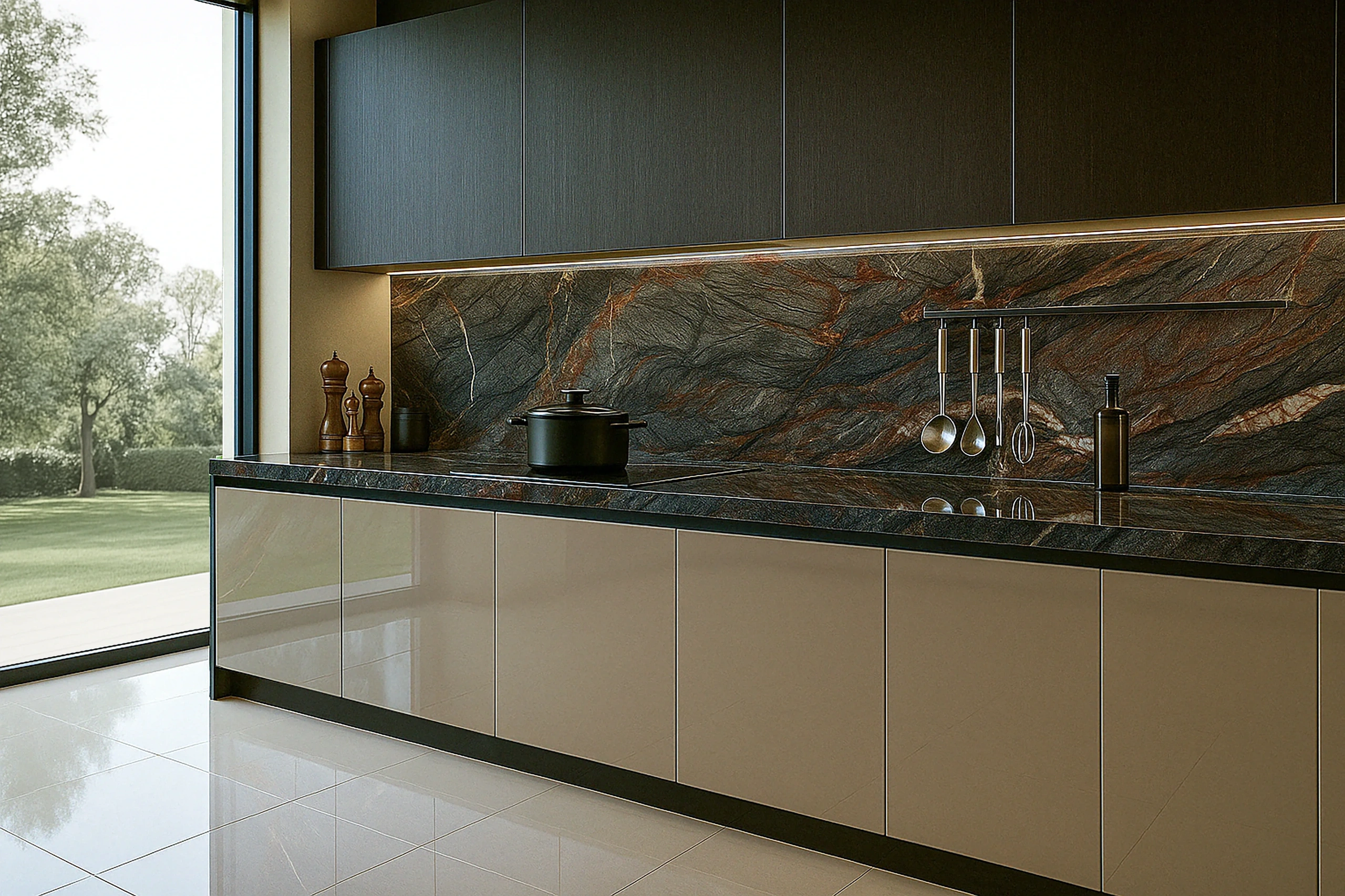 A dramatic slate-black canvas streaked with molten rust and lightning-white veins, Gulong Gorge evokes the raw, layered beauty of a canyon’s depths. Its bold contrasts and dynamic textures infuse any space with elemental drama and refined edge.